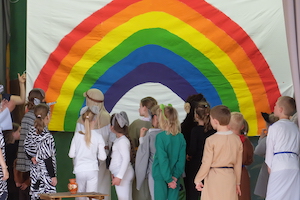 Unterstützt wird die Musical-Aufführung von Sponsoren - "und ganz tatkräftig von den Eltern, zum Teil auch von Großeltern", sagt Iris Thierolf dankbar: So haben diese etwa die gesamte Kulisse gebaut, große Tücher bemalt, Kostüme genäht und sind auch schon bei den Proben im Hintergrund stets mit dabei. Mal gilt es zu schminken, mal Kulissen zu schieben - oder aber zum Schluss den Regenbogen zu halten. Und, ganz wichtig: bei den wöchentlichen Proben auch schonmal Applaus zu spenden.