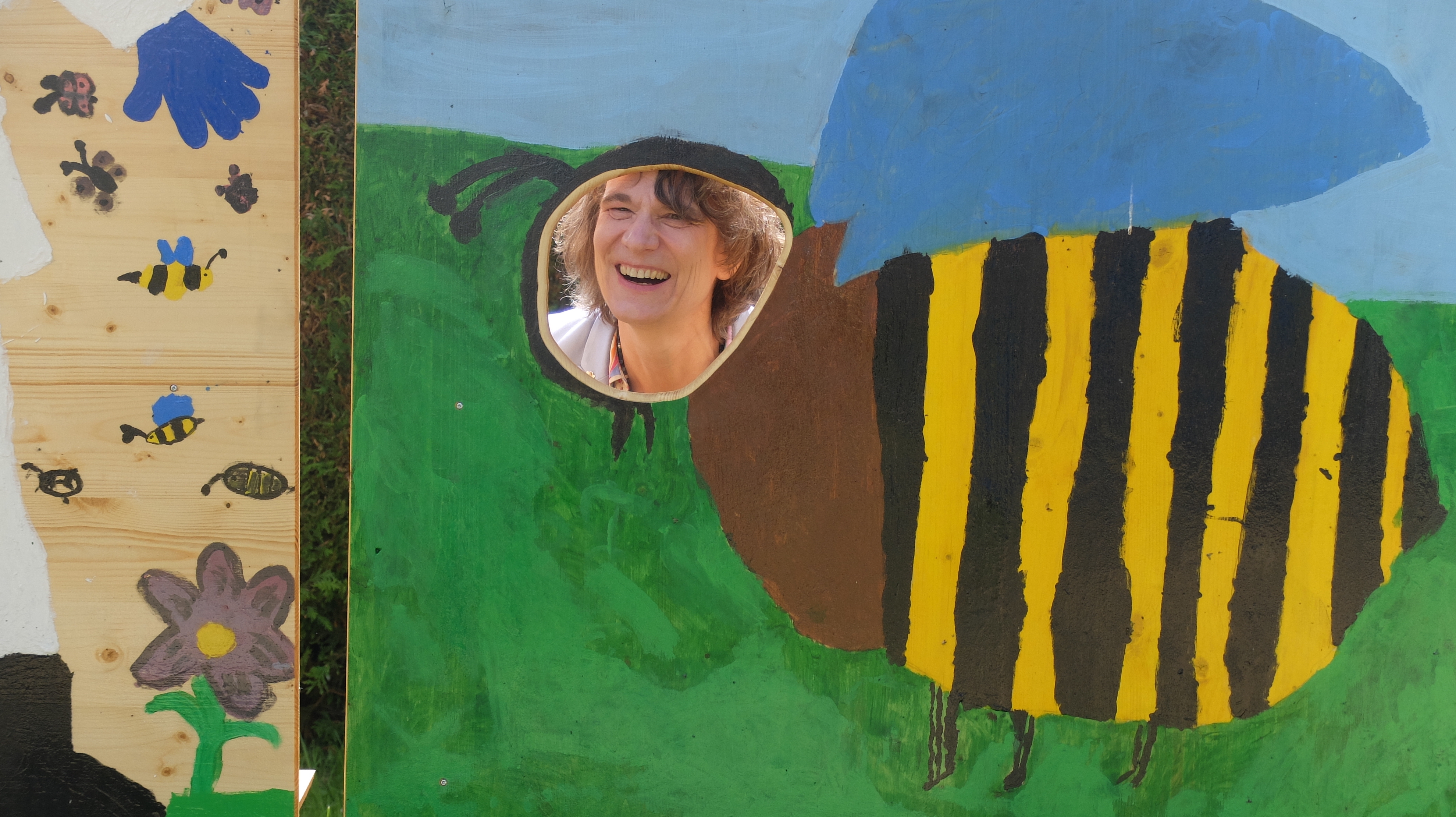 Das Fest stand ganz im Zeichen der Bienen; so säumten etwa ungezählte kleine Pappbienchen die Wege. Unterhalb der evangelischen Kirche, die auch Nachbarin des Schulgebäudes ist, wurde der neugestaltete BienchenLernPfad eröffnet. Hier gibt es auf Schritt und Tritt kindgerechte Infos über das Leben der Bienen und darüber, was alles passiert zwischen Blüte und Honigglas, getreu dem Motto: je anschaulicher, desto besser.