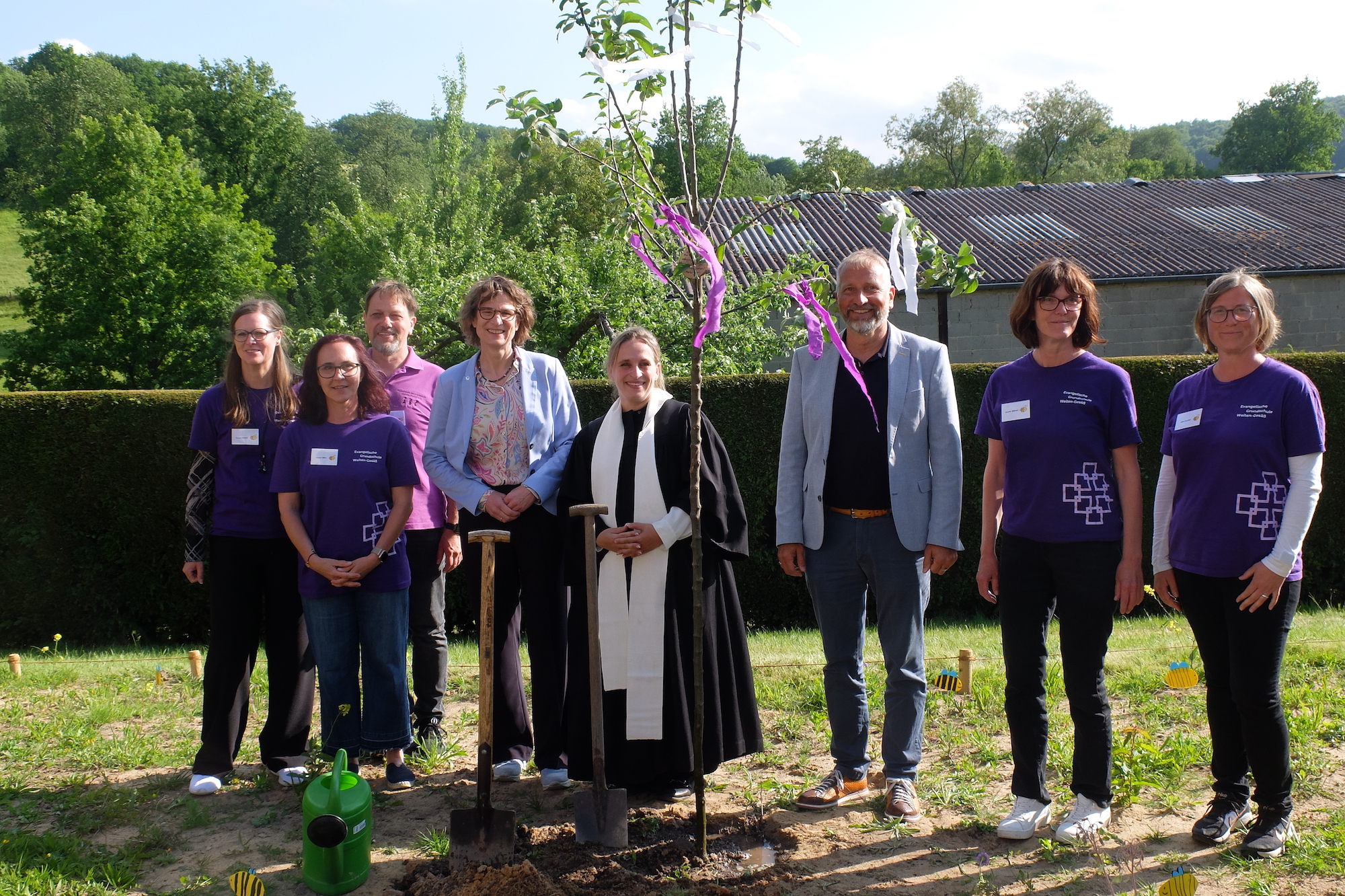 Zum Abschluss pflanzte Kirchenpräsidentin Tietz gemeinsam mit Kirchenvorsteherin Inge Krannich und Pfarrerin Peereboom unterhalb der Kirche beim BienchenLernPfad einen Goldparmänen-Baum, sicherlich auch eingedenk des Luther zugeschriebenen Satzes, dass es sich jederzeit lohne, einen Apfelbaum zu pflanzen. "Möge er Früchte bringen", wünschte Inge Krannich.