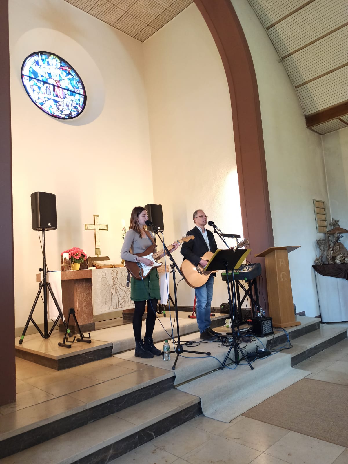 Bei schönem Frühlingswetter genossen die zahlreichen Besucherinnen und Besucher dann Kaffee und Kuchen und nutzten die Zeit für Gespräche. Am frühen Abend startete schließlich das Konzert mit dem Sänger und Gitarristen Jochen Günther und seiner musikalischen Partnerin Leonie Erbenich aus Rheinhessen (Foto). Die beiden hatten neben ihren Instrumenten in ihren Gitarrenkoffern Melodien der Beatles, von Simon and Garfunkel, Barclay James Harvest und anderen namhaften Künstlern mit in den Odenwald gebracht.