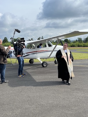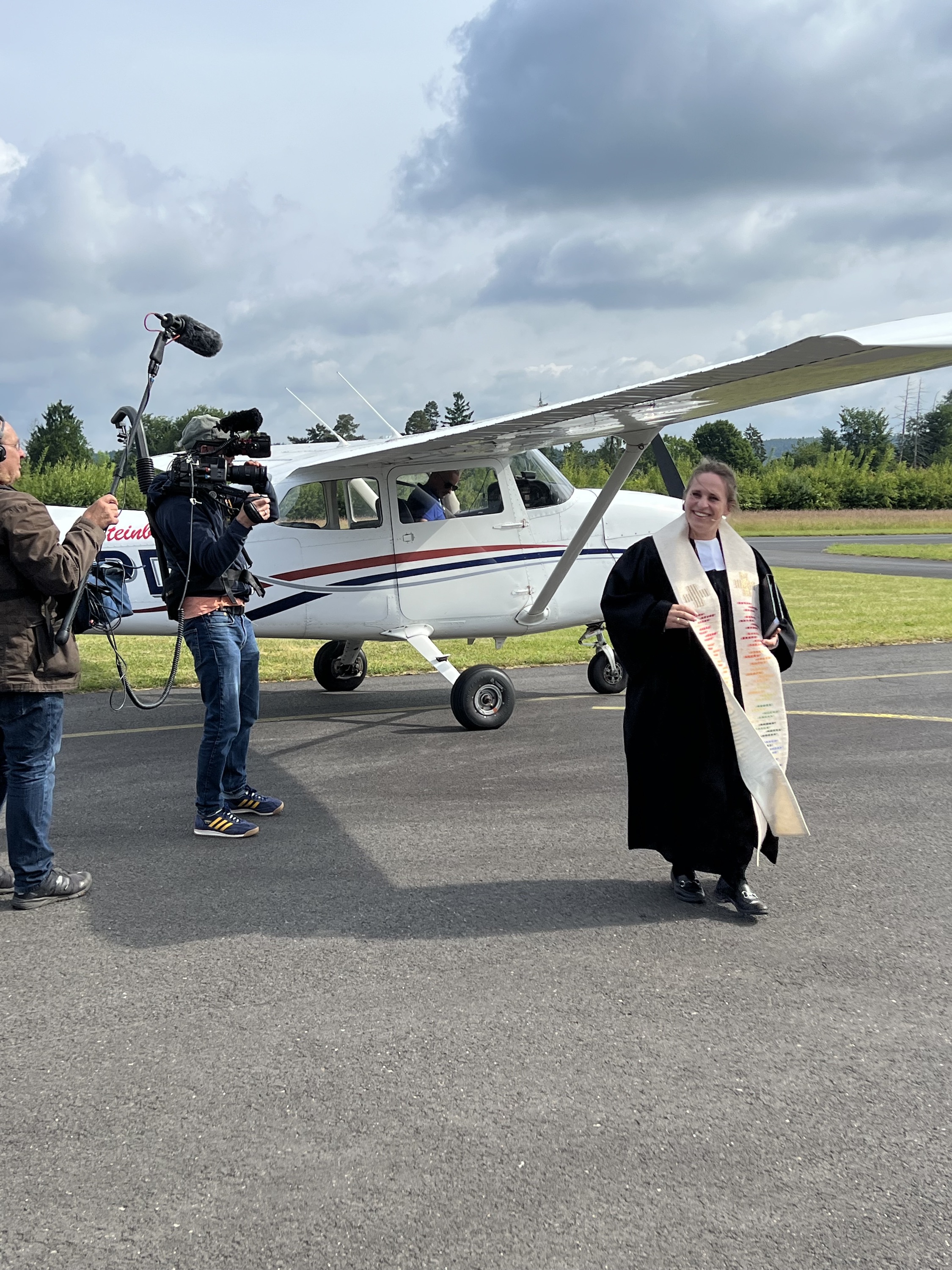 Als besondere Gäste war ein dreiköpfiges Team des 'hr-Fernsehens' um Reporter Franco Foraci dabei. Sie filmten vor und während des Gottesdienstes und interviewten Gäste für einen Beitrag, der am Abend des Himmelfahrtstages die 'hessenschau' eröffnete (in der ARD-Mediathek noch zu sehen). Auch bei einem Flug über Michelstadt vorab begleitete das Fernsehen Pfarrerin Peereboom.