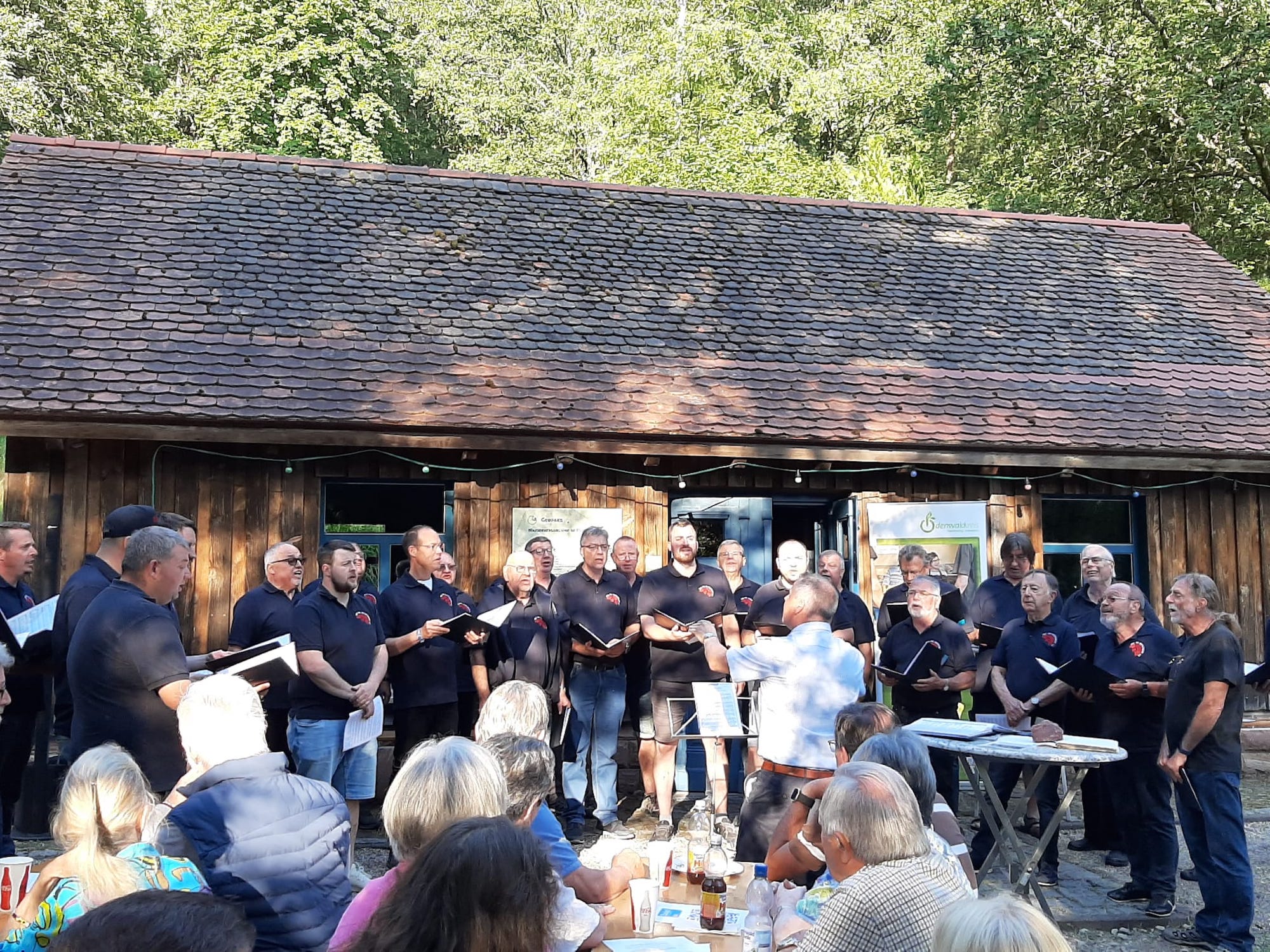 Rothenberg. Bei bestem Wetter übergab Erster Kreisbeigeordneter Oliver Grobeis Ende Juni unter freiem Himmel vor dem Pumpenhäuschen Rothenberg Ehrenamts-Cards an engagierte Bürgerinnen und Bürger. Gastgeber war der Verkehrs- und Verschönerungsverein Rothenberg, der den Gästen zu Beginn Wissenswertes über die Wasserpumpe und die Aktivitäten des Vereins vermittelte. Dafür wurde die Pumpe, die es in Deutschland nur noch ein weiteres Mal in einem Museum gibt, in Betrieb genommen. Den offiziellen Teil der Veranstaltung leitete dann der Männergesangverein 1911 Rothenberg musikalisch ein (Foto unten).