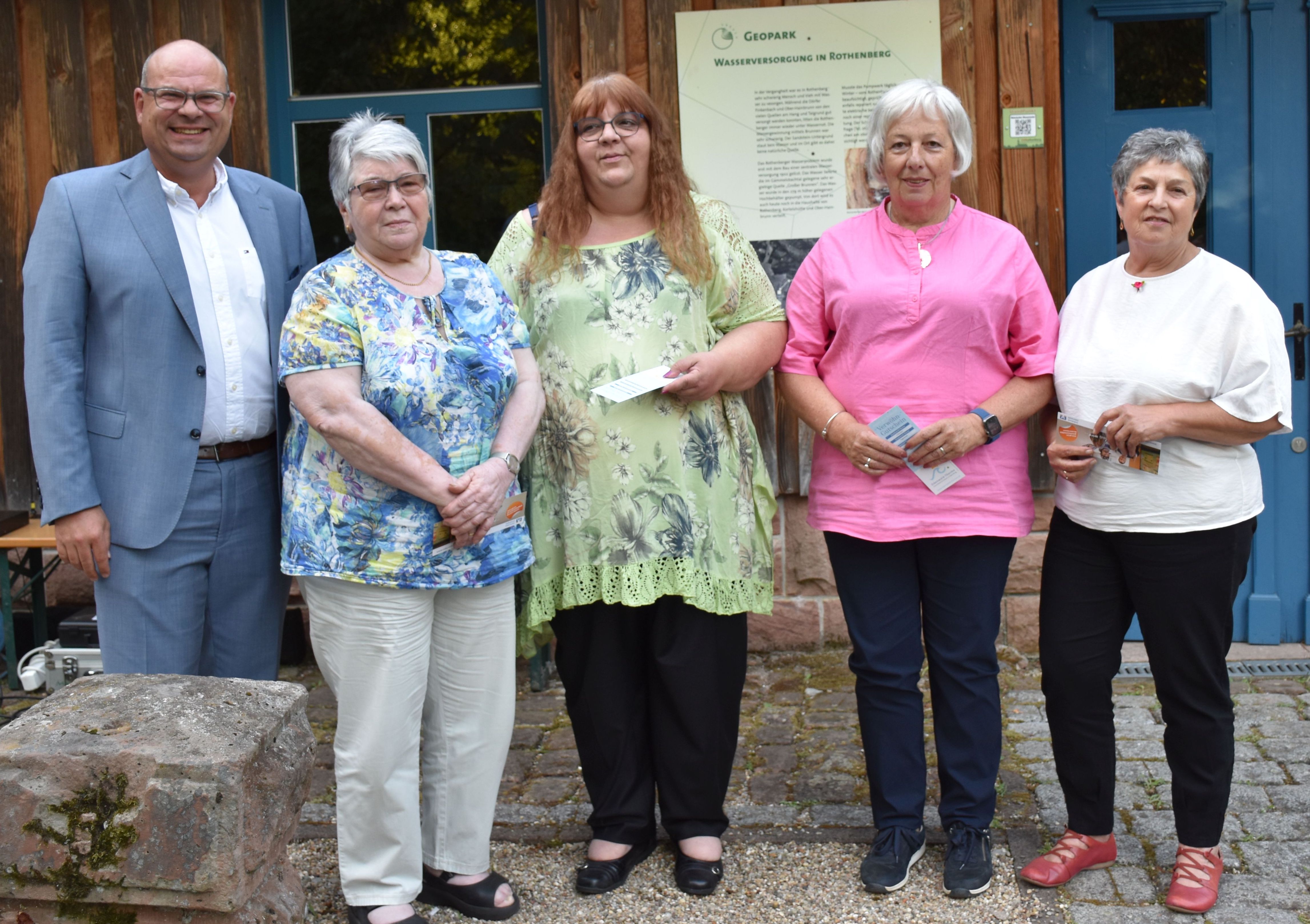 In Rothenberg überreichte Oliver Grobeis (Foto, von links) unter anderem an vier engagierte Mitarbeiterinnen der Evangelischen Kirchengemeinde Kirchbrombach die E-Card des Landes Hessen: Renate Daum, Ute Karl, Edith Wagner und Karin Seeger.