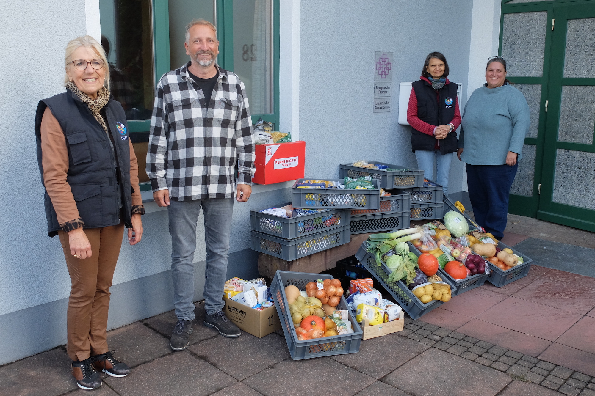 Dekanat Odenwald/Steinbach. Blumenkohl, Kürbisse, Zwiebeln, Kartoffeln - herbstlich bunt war der Inhalt der Kisten, welche in der Evangelischen Kirchengemeinde Steinbach zu Erntedank an die Erbach-Michelstädter Tafel gespendet wurden. Sonja Schimpf (links), die Zweite Vorsitzende der Tafel, holte die Gaben zusammen mit der ehrenamtlichen Tafel-Mitarbeiterin Ina Retzmann (2. von rechts) nun ab, Ortspfarrerin Kerstin Peiper (rechts) und der Odenwälder Dekan Carsten Stein freuten sich darüber, dass Gemeindemitglieder so viele Esswaren gespendet hatten. In den Kisten fanden sich außerdem Nudeln, Haferflocken, Konserven, Tütensuppen, Süßes und noch etliches andere mehr.