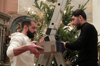 Neckarsteinach. Punkt 18 Uhr öffnet sich die Kirchentür, und zunächst ist nur eine Tannenspitze zu sehen. Nach kurzem Feststecken im zu engen Durchgang werden fünf Personen sichtbar und bringen den stattlichen Baum, welcher in diesem Jahr der Weihnachtsbaum sein wird, ins Gotteshaus. Zwei von ihnen sind die Cousins Marwan und Dulovan. Die beiden Kurden sind vor ein paar Jahren aus Syrien geflohen; drei Monate dauerte der Weg über Irak, Iran, Türkei, Rumänien und Bulgarien. Oft waren sie zu Fuß unterwegs, gelegentlich ein Stück mit dem Auto oder in einem LKW.