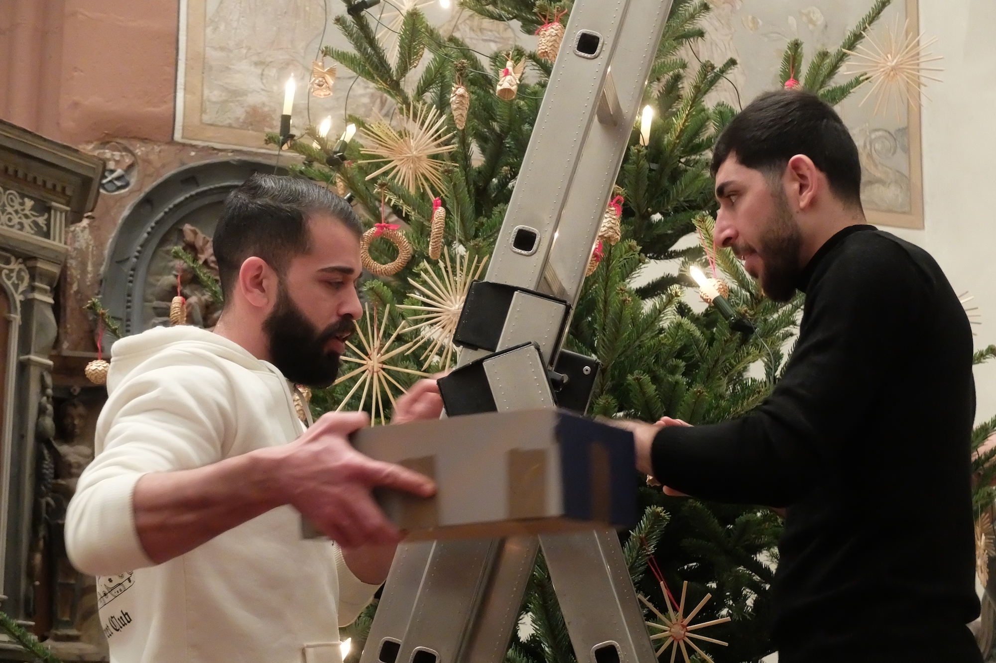 "Sie haben uns geholfen, und deshalb komme ich auch immer gerne und helfe", erklärt der 27-jährige Marwan, dessen Hemd von Tannennadeln übersät ist. Dazu gehört nun auch das Schmücken des Christbaums. Aber die beiden Muslime haben auch schon mal das Martin-Luther-Haus aufgeräumt und das Gelände ums Gebäude gefegt.